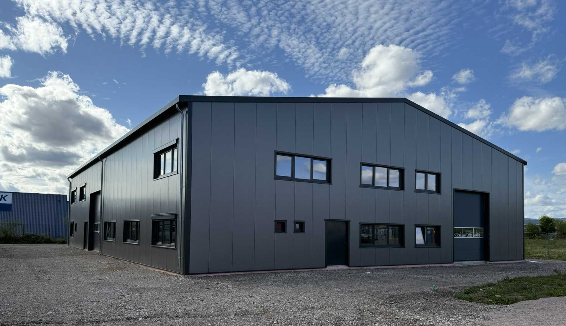 Lager- u. Montagehalle, 2 eigenständige Hallenbereiche, mit Büroeinbauten auf zwei Etagen. Photovoltaik und Luftwärmepumpe. Umweltschonende Regenwasserversickerung durch Sickermulden. Aufwändiges Teilungskonzept, detaillierte Kostenschätzungen.